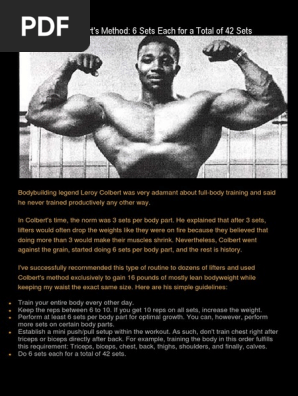 Like most full body workouts he recommended doing them three times a week on alternating days with no weight training performed on rest days. Keep the reps between 6 to 10. Leroy Colberts Method 6 Sets Each for a Total of 42 Sets.